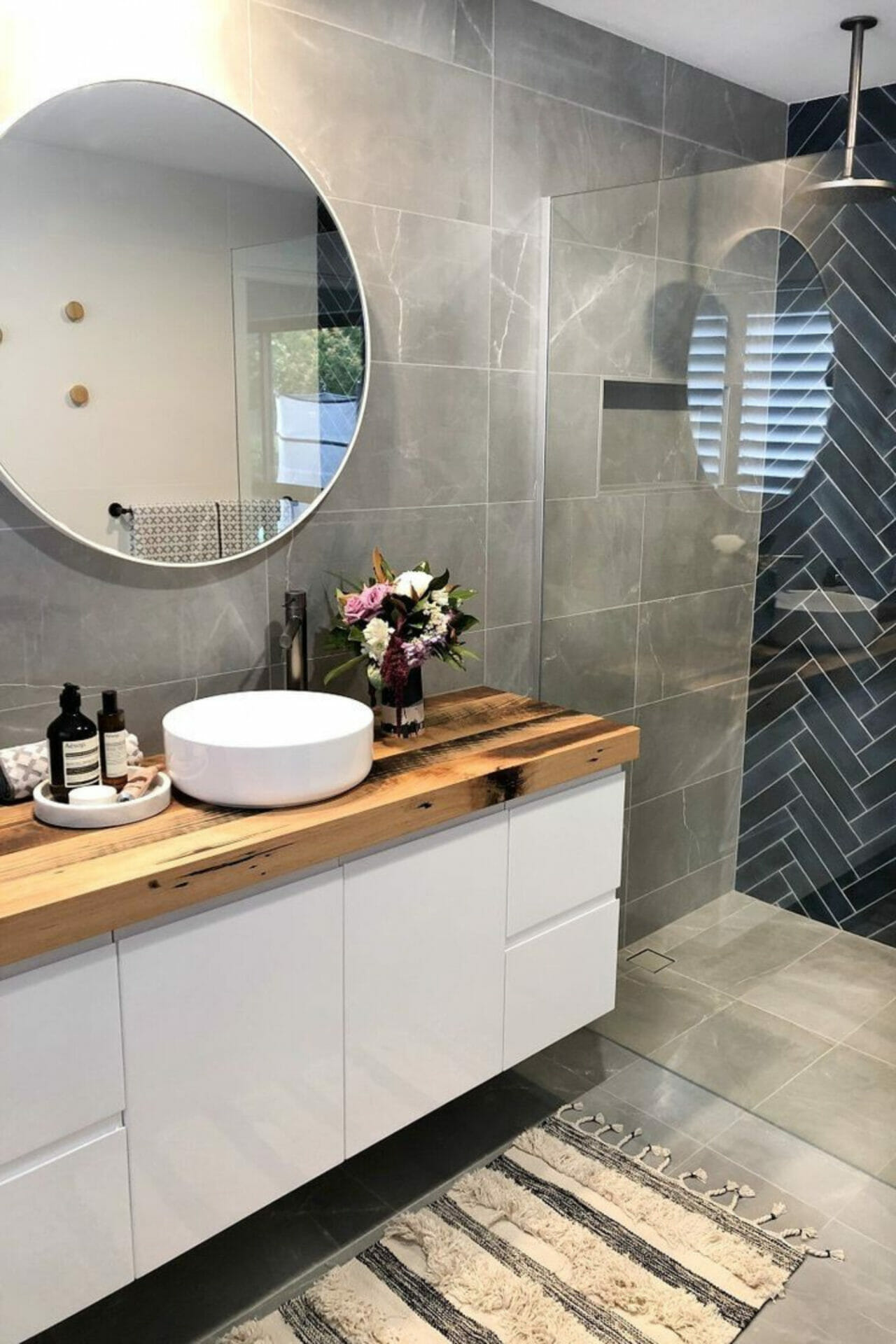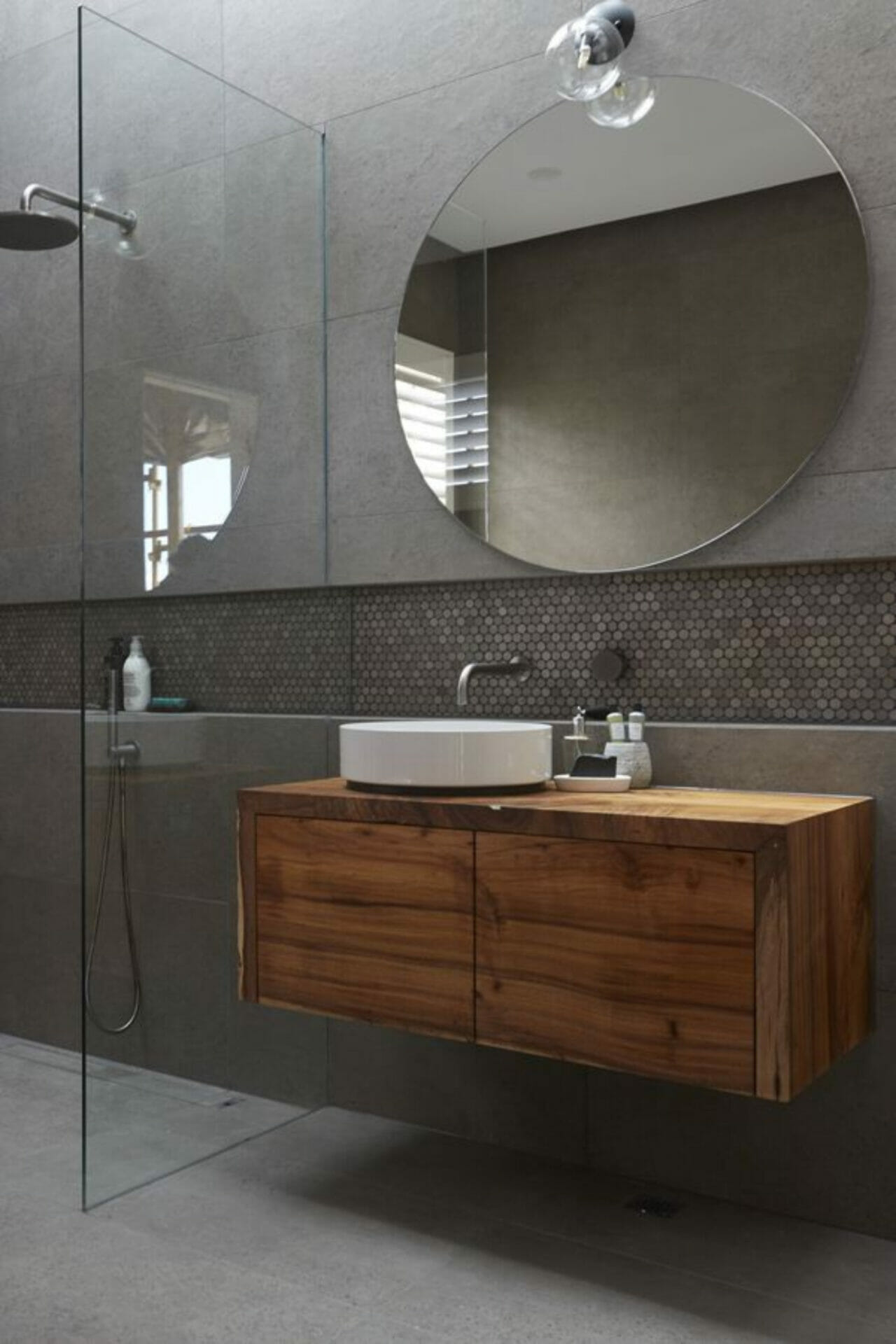 - Γκρι ανάγλυφα πλακάκια και πιο σκούρα ψηφίδα διακοσμητική, έπιπλο μπάνιου σε αποχρώσεις του ξύλου και ένας μεγάλος στρογγυλός καθρέφτης θα κάνει τη διαφορά στο μπάνιο σας.
