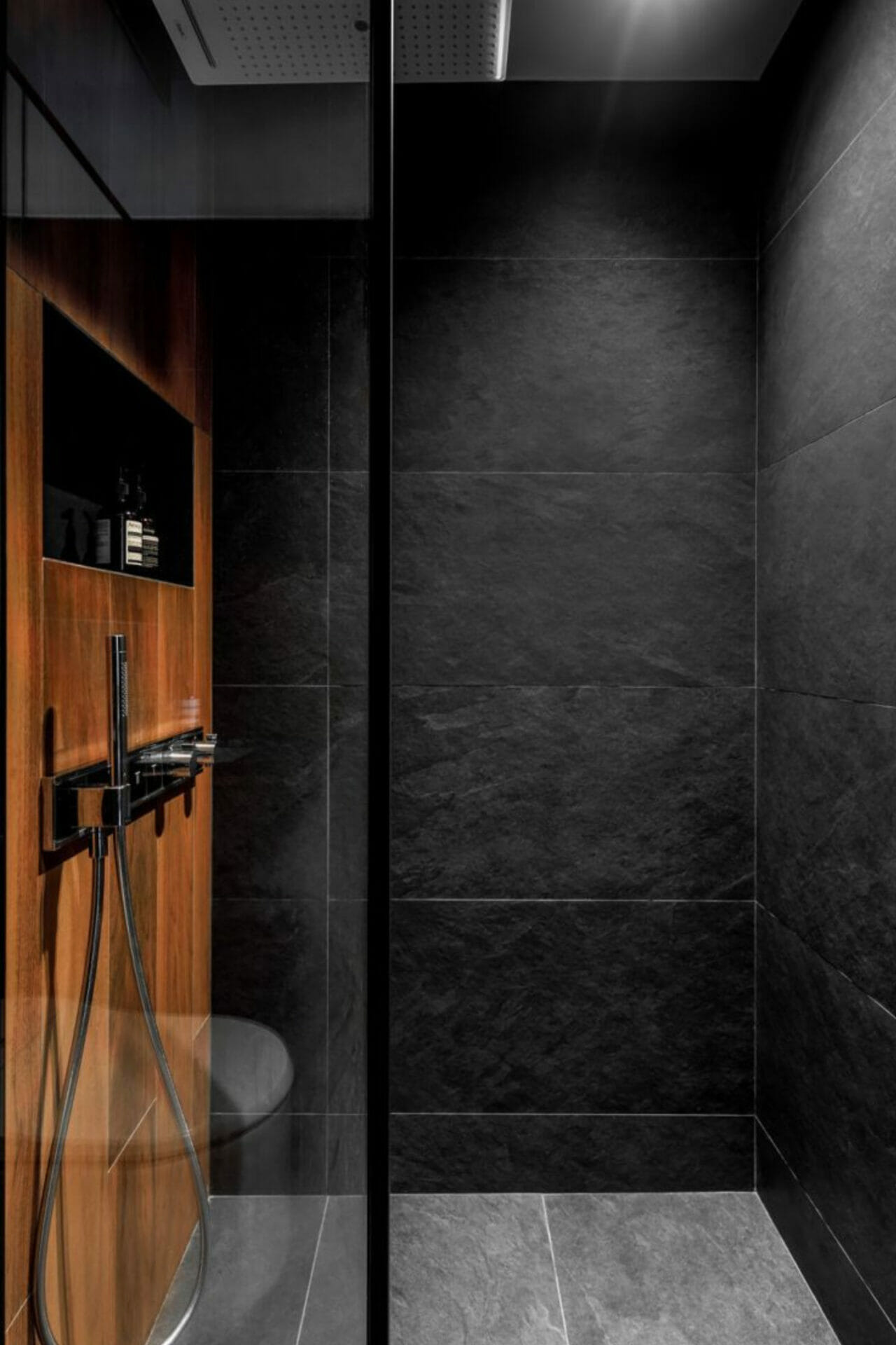 Πλακάκι γκρι ματ μέχρι το ταβάνι του μπάνιου σας για εντυπωσιακό αποτέλεσμα. Μαύρα αξεσουάρ δένουν αρμονικά με τον υπόλοιπο χώρο και δίνουν μια απέριττη απλότητα. Μπανιέρα ελεύθερης τοποθέτησης με μαύρη ματ μπαταρία λουτρού.