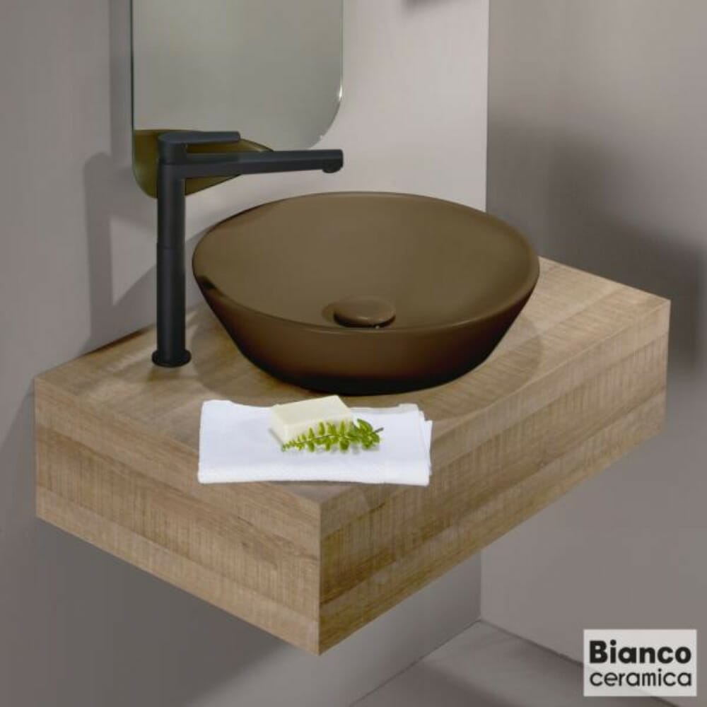 Στρογγυλός νιπτήρας μπάνιου Lupo της εταιρείας Bianco Ceramica, κατασκευασμένος από πορσελάνη. Η πορσελάνη είναι ένα υλικό υψηλής υγιεινής, διότι είναι ελάχιστα πορώδης και δεν επιτρέπει στα μικρόβια να εισχωρήσουν. Επίσης καθαρίζεται πολύ εύκολα. Το αρνητικό της πορσελάνης, αν και έχει μεγάλη αντοχή στις φθορές, είναι ότι αν ραγίσει ή χτυπηθεί, δεν επισκευάζεται.