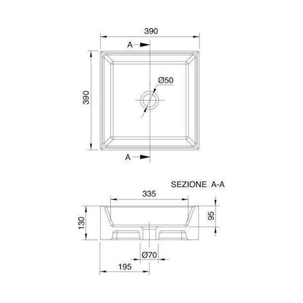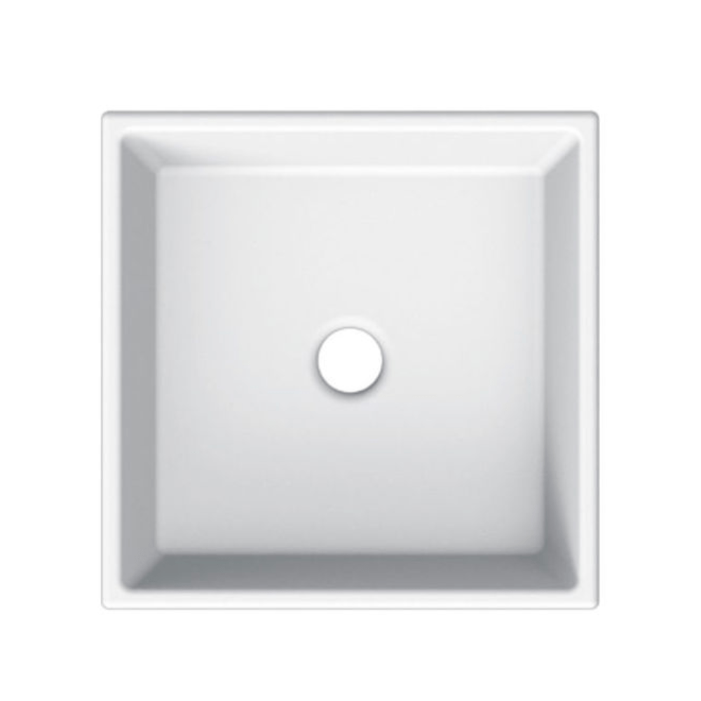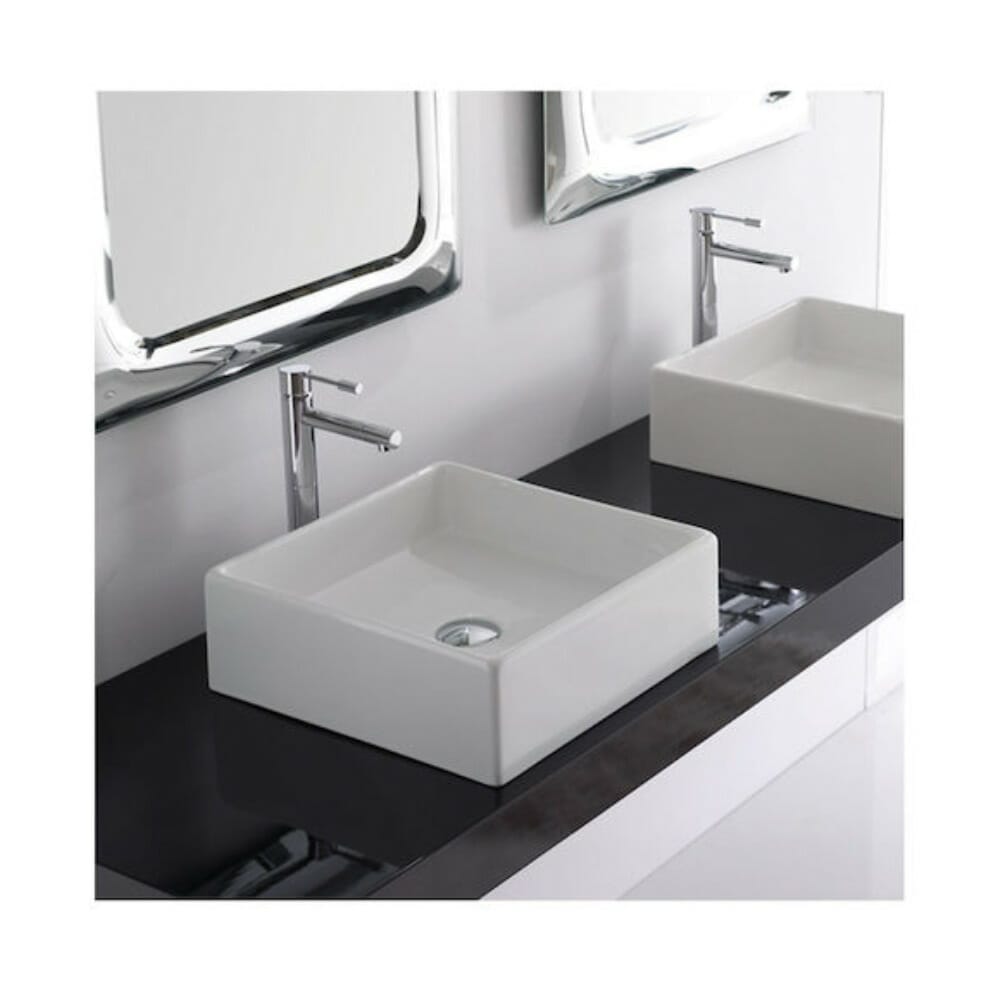 Τετράγωνος νιπτήρας μπάνιου Teorema της εταιρείας Scarabeo, κατασκευασμένος από πορσελάνη. Η πορσελάνη είναι ένα υλικό υψηλής υγιεινής, διότι είναι ελάχιστα πορώδης και δεν επιτρέπει στα μικρόβια να εισχωρήσουν. Επίσης καθαρίζεται πολύ εύκολα. Το αρνητικό της πορσελάνης, αν και έχει μεγάλη αντοχή στις φθορές, είναι ότι αν ραγίσει ή χτυπηθεί, δεν επισκευάζεται.